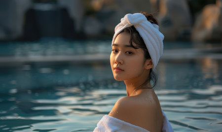 A tranquil spa setting is presented featuring a wooden structure over a water-filled basin. Soft towels are neatly stacked near a window with lush green plants. The image employs warm lighting and a muted color palette, conveying a sense of serenity. Suitable for lifestyle, wellness, or relaxation-themed commercial applications.