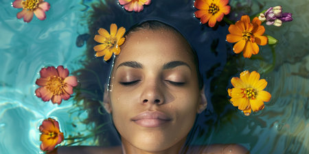 Young woman relaxing in water surrounded by fresh flowers