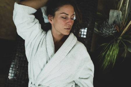 A young Woman in a white coat Relaxes in a SPA therapy room. Spa hotel relaxation concept.