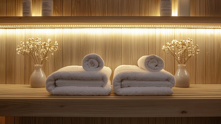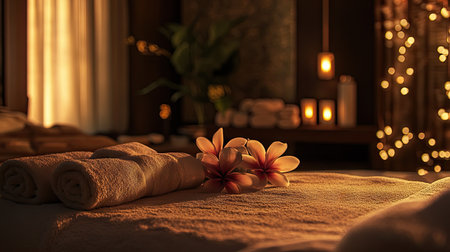 A serene spa setting featuring rolled towels, decorative flowers, and warm lighting, perfect for promoting relaxation and a calming atmosphere.