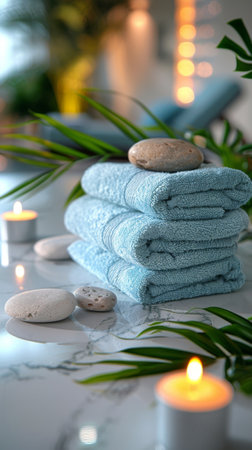 A serene spa arrangement featuring soft towels, glowing candles, and smooth stones invites relaxation and tranquility in a soothing environment. Perfect for wellness themes.