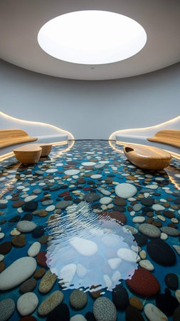 Water flowing from a stone fountain creates a tranquil atmosphere in a spa, with bamboo and candles enhancing the serene ambiance around the massage bed