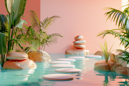 A serene composition featuring soft textiles, delicate pink blossoms, and balanced black stones, perfect for conveying peace and tranquility in wellness settings.