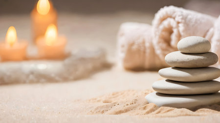 Spa still life with zen stones, towels and candles on sand