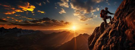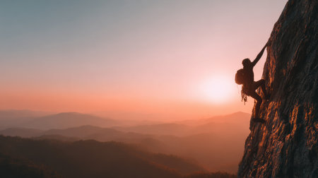 Mountain climber scaling steep rock face with colorful sunset over mountain range in background