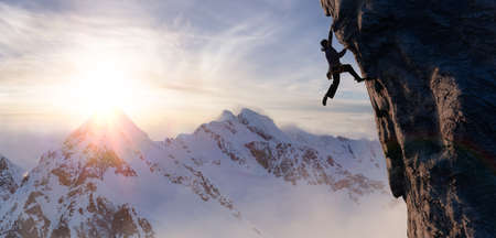 Adult adventurous man Rock Climbing a steep rocky cliff. Extreme adventure composite. 3d rendering mountain artwork. Aerial background landscape from British Columbia, Canada. Sunset Sky