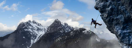 Adult adventurous man rappelling down a rocky cliff. Extreme adventure composite. 3d rendering mountain artwork. Aerial background landscape from British Columbia, Canada. Cloudy Sky