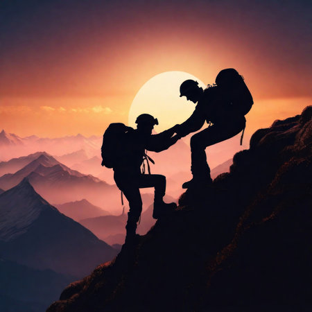 Illustration: Silhouettes of hikers helping each other climb to the top, concept of helping each other, teamwork. Generative AI