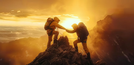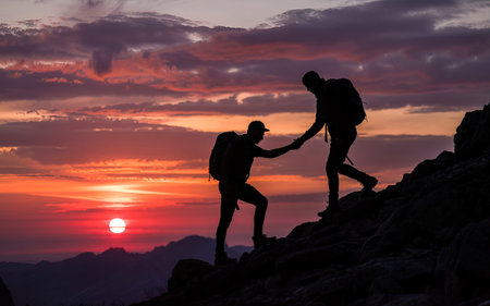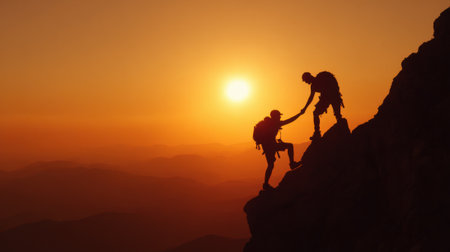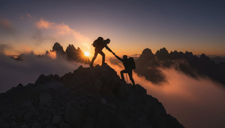 Two mountaineers are silhouetted against a dramatic sunset sky, one extending a hand to assist the other on a rugged mountain peak. Below them, a sea of clouds stretches across the landscape, creating an inspiring scene of human resilience, teamwork, and adventure in a challenging natural environment.