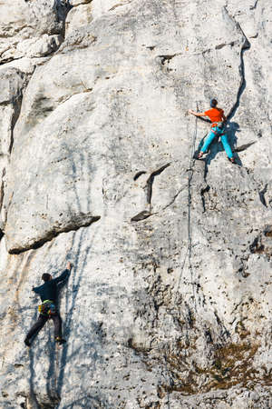 young men are climbing in hight rocks