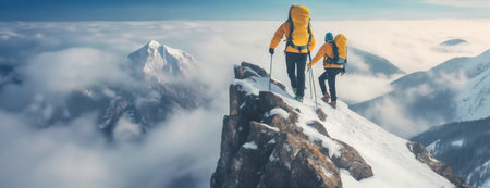 A team of skiers and climbers travel through the snow-capped mountains high above the clouds during vacation and winter holidays. Concept of traveling around the world, recreation, winter sports, vacations, tourism in the mountains and unusual places