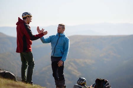 Paragliders high fiving after walking up hill to paragliding starting point, on a sunny morning in mountains.