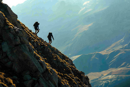 Hikers navigating treacherous mountain terrain, representing resilience and exploration – this image is AI Generative.