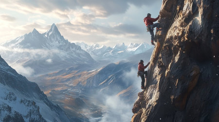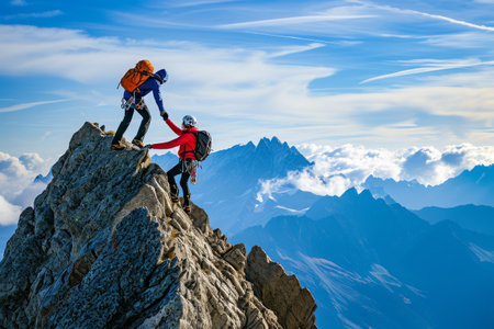 two climbers help each other in the mountains, Generative AI