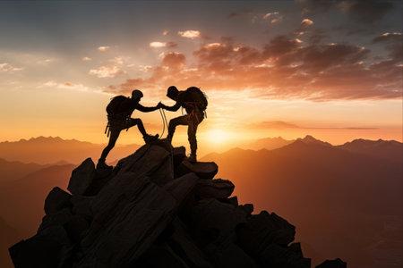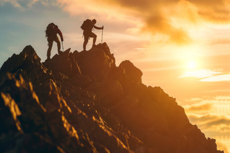 Two individuals ascending a mountain while the golden sun sets in the background, Hiker's spirit against the mountain’s might, helping friend reach the top, AI Generated