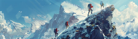 A concept art illustration featuring a brave team of hikers reaching the summit of a snow-covered mountain, with a vast blue sky in the background The image is a wide shot, displaying the sense of
