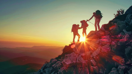 People helping each other hike up a mountain at sunrise, Giving helping hand and teamwork.