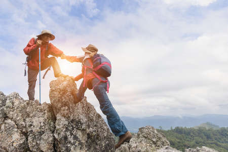 Young man and women backpacker are climbing a mountain, A man stretching his hand to pull a woman up to succeed in their climb, Couple are good teamwork. They both hiked on a clear day.