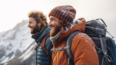 A couple of people standing on top of a snow-covered mountain, surrounded by a majestic winter landscape, A moment of triumph shared between friends on a difficult mountain climb, AI Generated