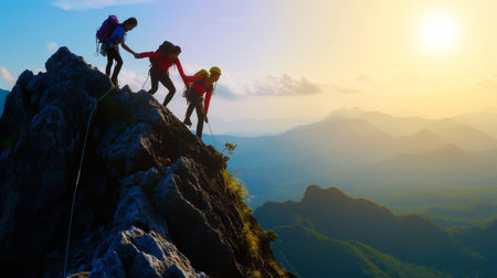 A dramatic scene of a team of climbers helping each other reach the summit at sunrise.