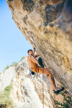 Athletic man climbs an overhanging rock with rope, lead climbing.