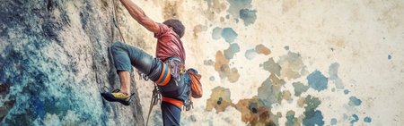 A climber ascends a rugged rock wall under the influence of a vibrant watercolor backdrop. The afternoon light enhances the action of this adventurous pursuit in nature.