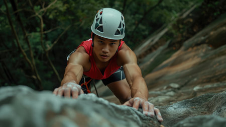 Focused Asian Rock Climber in Red Tank Top and Helmet