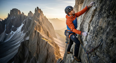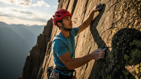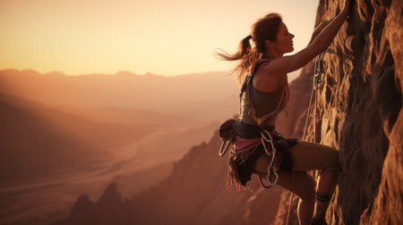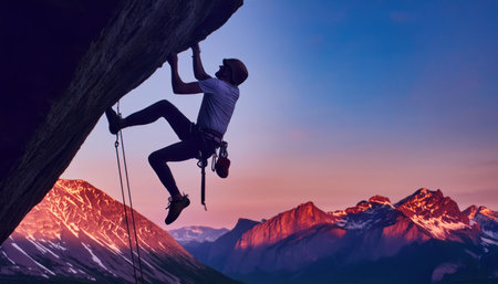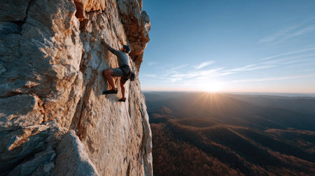 A climber skillfully scales a rugged rock face as the sun sets in the background, illuminating the mountainous terrain. The athlete is equipped with climbing gear, showcasing determination and focus. The warm light enhances the beauty of the outdoor adventure.