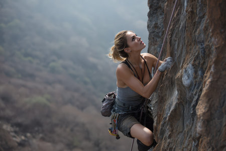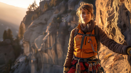 Ascending Heights: Woman Mountaineer Conquers Challenges while Scaling Majestic Rock Faces