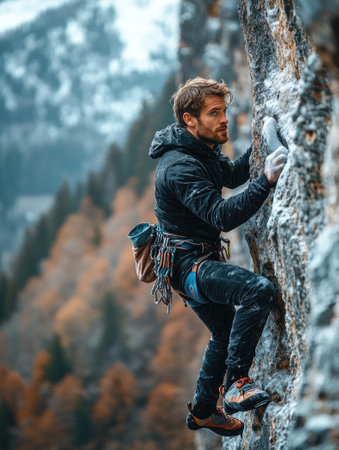 Conquering the Heights: A Thrilling Man Climbing on a Majestic Rock Mountain