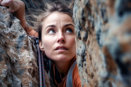 A determined female hiker actively grips a rugged rock face, showcasing strength and focus during a challenging climb. Ai-Generated