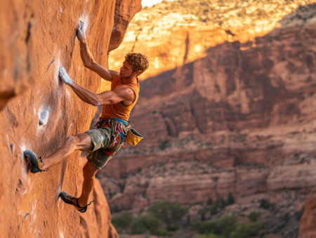 Young climber is scaling a difficult rock face, using his strength and determination to reach the top