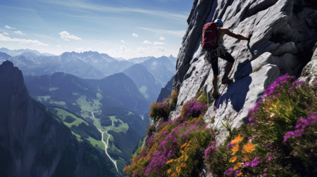 A determined climber skillfully scales a steep cliff, surrounded by a colorful display of wildflowers. The sun sets behind the mountains, casting a warm glow on the scene.