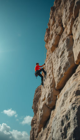 A determined climber in a vibrant red shirt ascends a steep rock face under a bright blue sky. The image captures the thrill of adventure and the spirit of perseverance against natures challenges.