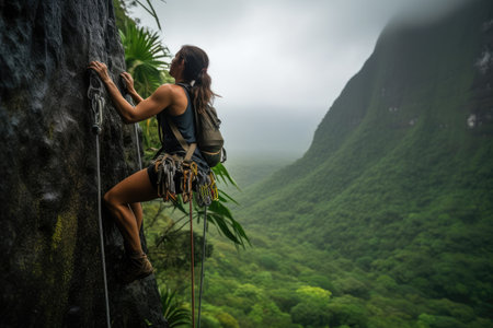 A girl climb up a steep cliff in deep rainforest. Outdoor adventure concept. AI generated.