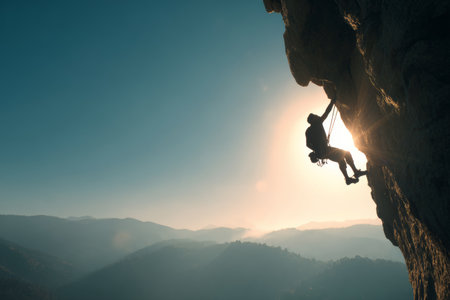 A dedicated rock climber scaling a steep cliff at sunset, showcasing thrilling adventure and breathtaking mountain scenery. Perfect for capturing the essence of outdoor sports.