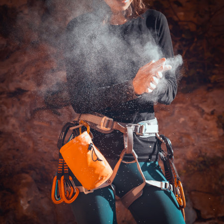 Unrecognizable young adult picking magnesium powder from a bag hanging on a belt with rock climbing gear