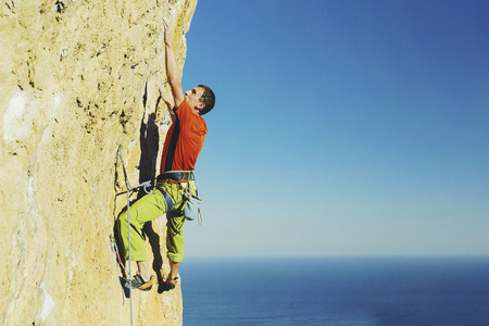 Sport climbing man is practising on a natural rock wall