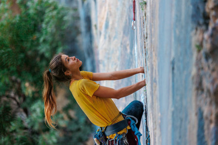 A strong girl climbs a rock, Rock climbing in Turkey, Training endurance and strength, Woman in extreme sport, Rock climber is training in nature.