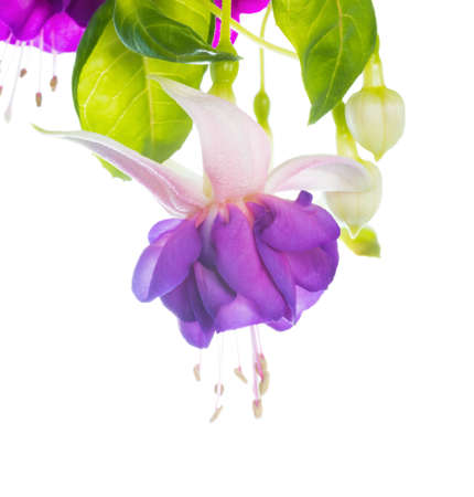 blooming beautiful twig of lilac and white fuchsia flower is isolated on white background, `Holly`s Beauty`, closeup