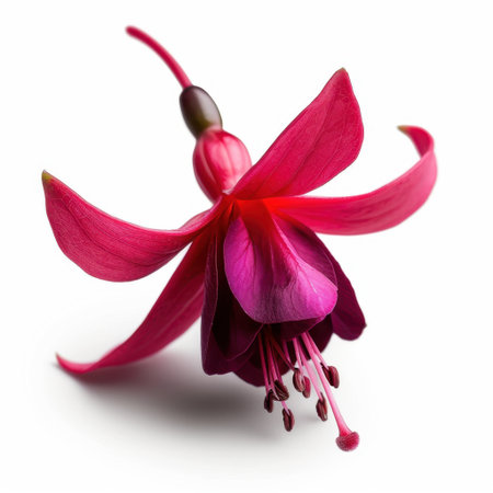 this fuchsia flower, showcased against a solid background, is captured in stunning detail, highlighting its delicate petals and intricate textures, evoking a sense of intimacy and realism, reminiscent of a micro photograph, perfect for botanical enthusiasts and nature lovers alike. ai generated