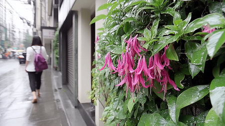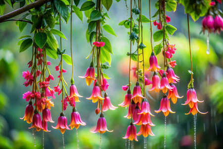 Vibrant magenta flowers, elongated and bell-shaped, hang gracefully, covered in sparkling raindrops. The surrounding green leaves are wet and glossy.