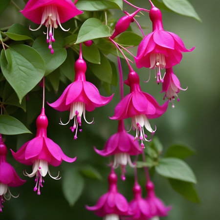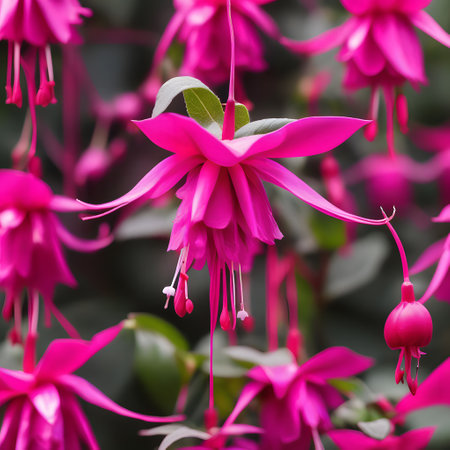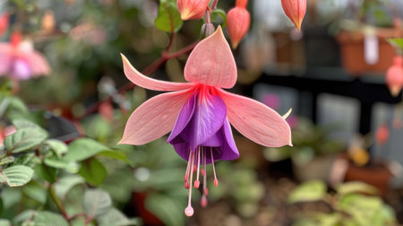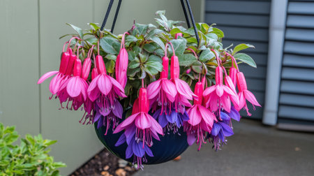 Fuchsia (Fuchsia spp.) Hanging plant with tubular, pendulous flowers in vibrant pink, purple, or red, ideal for baskets or pots,