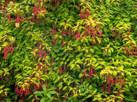 Beautiful flowers of Fuchsia magellanica also known as Hardy fuchsia. Flowering plant in evening primrose family onagraceae. Ornamental garden plant.
