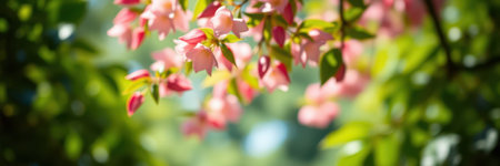Vivid pink flowers hang gracefully from branches in a lush garden under warm sunlight creating a serene and colorful atmosphere.