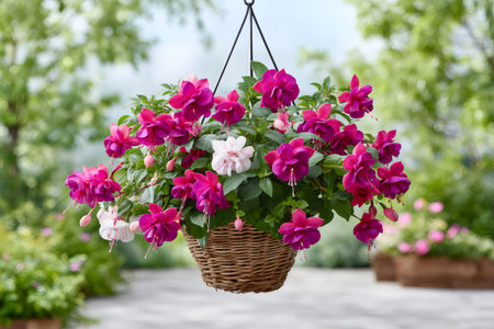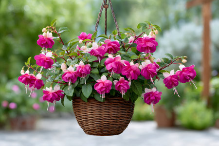 Vibrant pink fuchsia flowers suspending from a rustic wicker basket in a summer garden