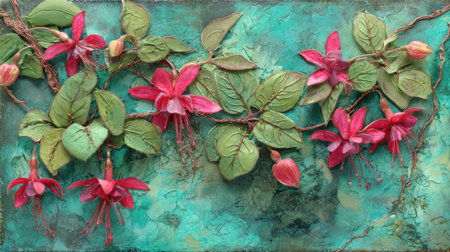 the fuchsia stands majestically against a sleek black background, its delicate petals and stems rendered in exquisite photorealistic detail, evoking the organic architecture of martin puryear and the whimsical illustrations of cicely mary barker, with high contrast shots accentuating its native brasilian motifs and graceful curves. ai generated