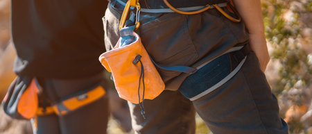 Closeup of a climbers chalk bag hanging from their harness used to keep their hands dry and improve grip