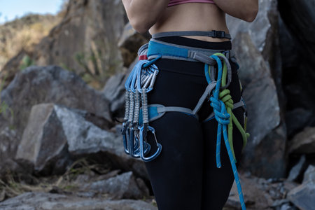 Close-up of female rock climber wearing safety harness with quickdraws and climbing equipment outdoor