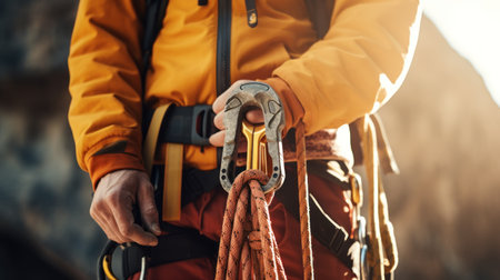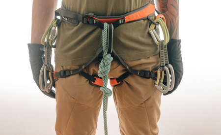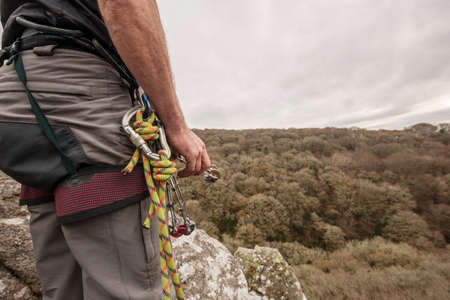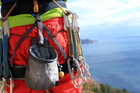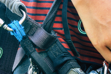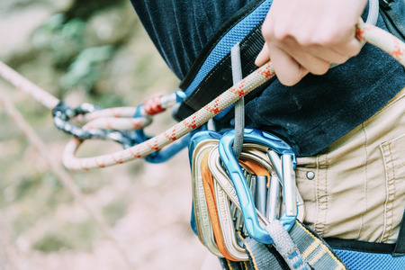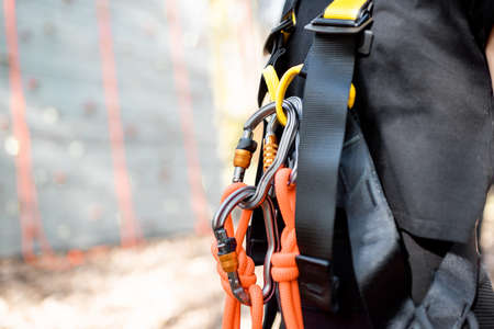 rock climbing gear,close up of Mountain climber wearing carabiners
